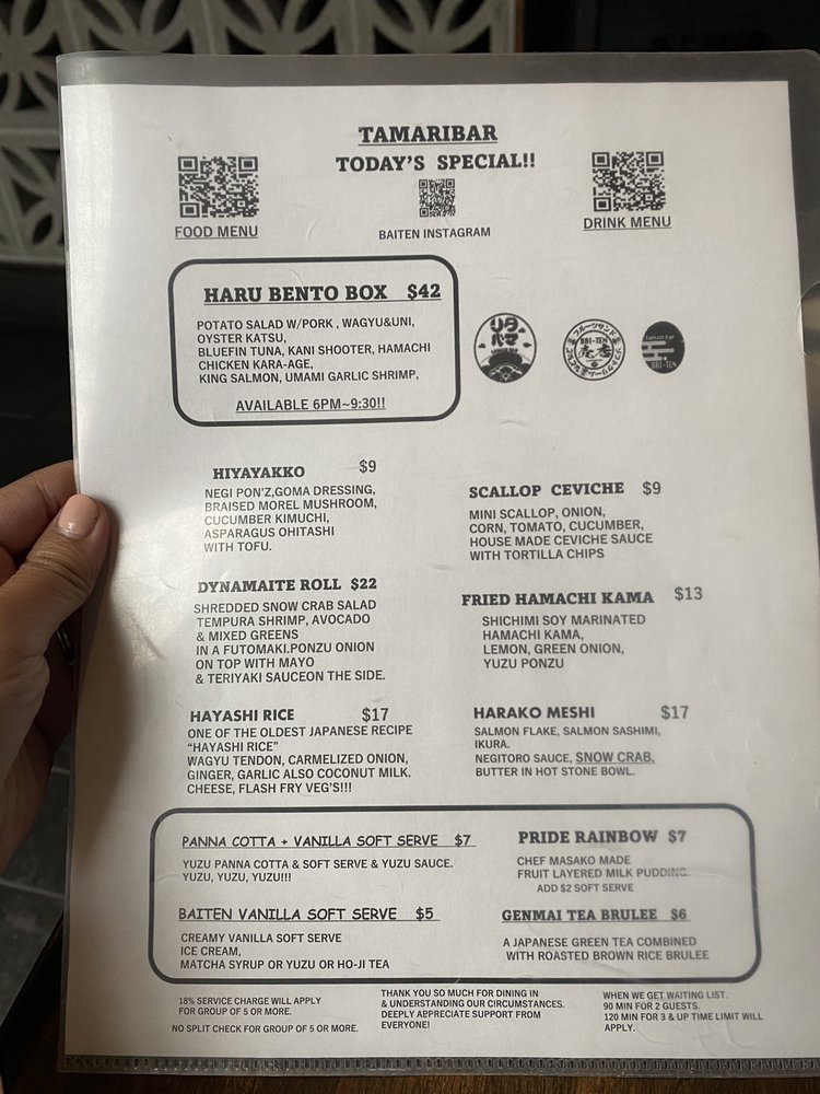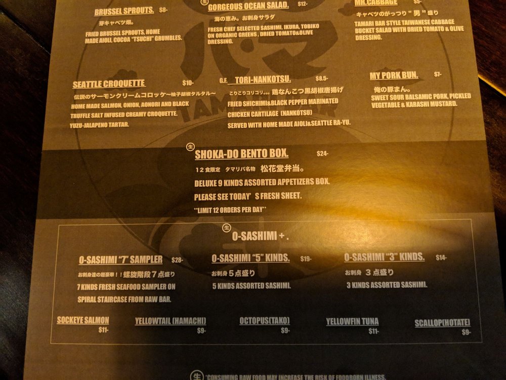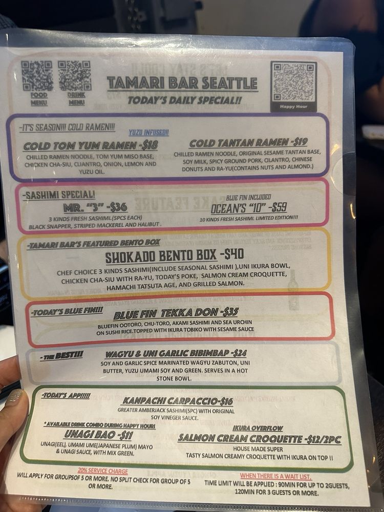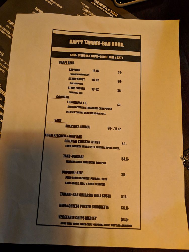 Tamari Bar in Seattle, WA, is a trendy izakaya offering a unique dining experience. With a focus on Japanese fusion cuisine, the menu features a variety of options for pescatarians, vegans, and vegetarians. The atmosphere is modern and inviting, perfect for a dinner or late-night outing. Customers rave about the delicious dishes, such as pork belly buns, chicken karage, dan dan noodles, curry pork katsu bowls, ocean salad, and wagyu beef. The bento box and chirashi bowl are standout items that showcase the chef's skills. While some customers feel the prices are on the higher side, the quality of the food and attentive service make it worth it. With happy hour specials and a full bar, Tamari Bar is a must-visit for those looking for a chic and flavorful dining experience in Capitol Hill.